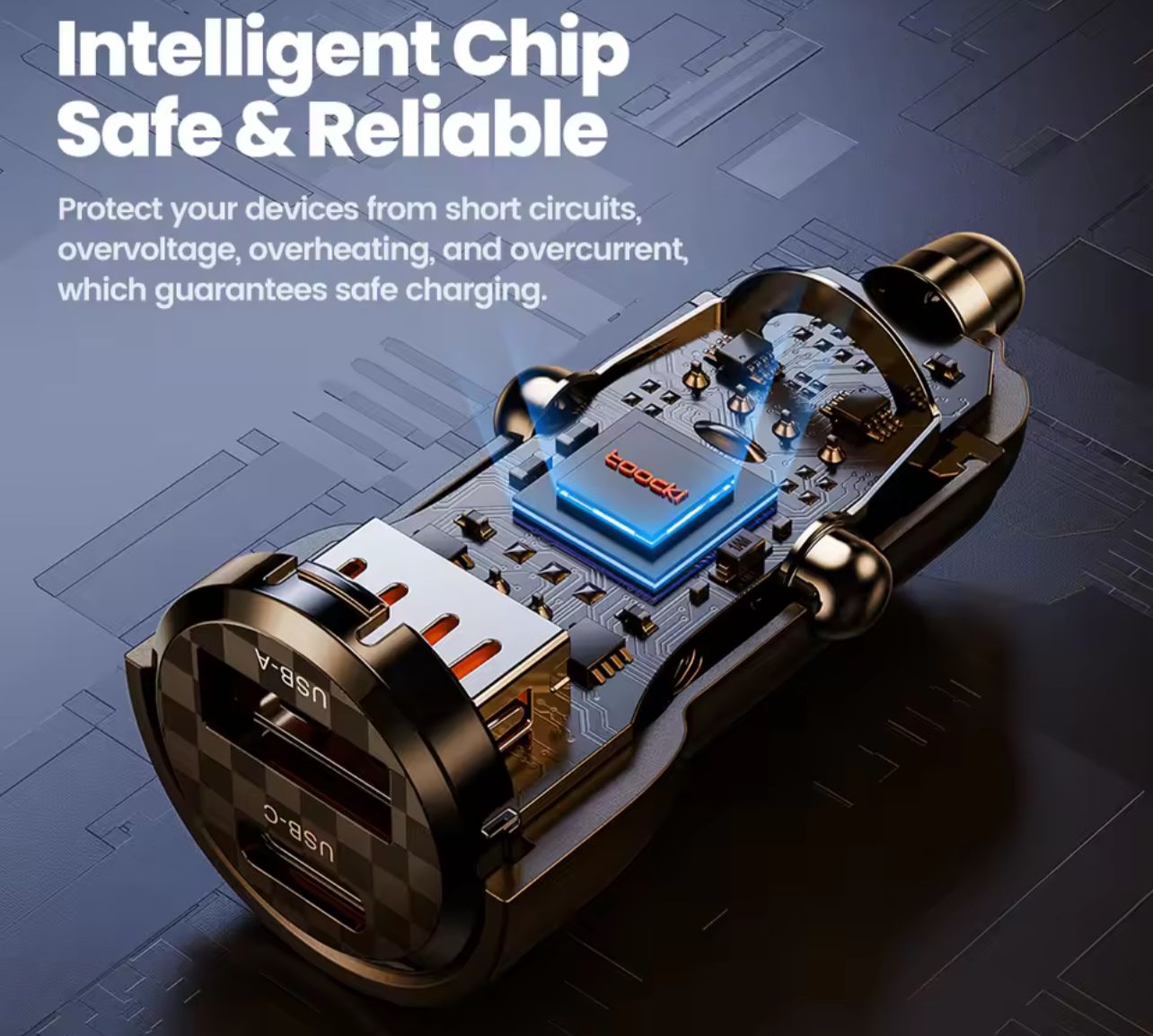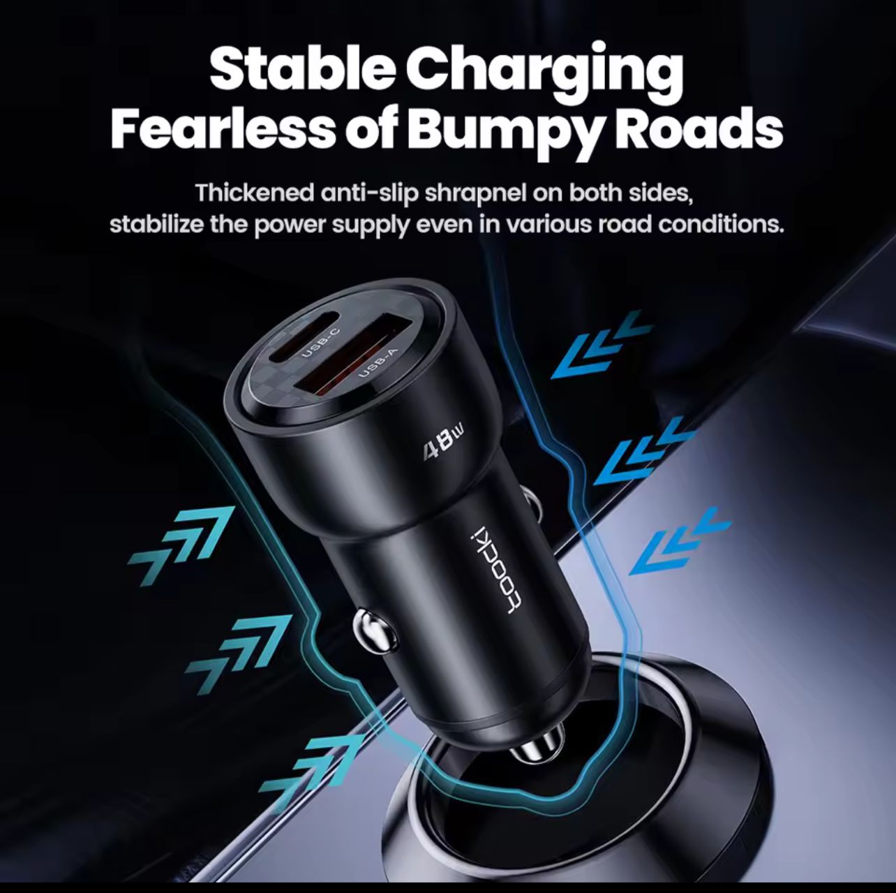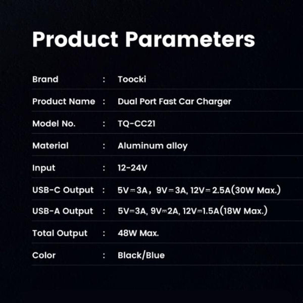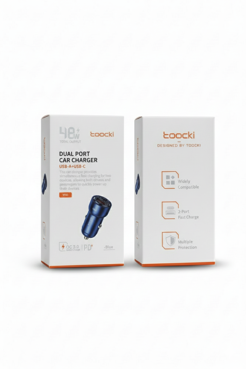 The Toocki 48W Dual Port Car Charger is a powerful and compact car charging solution designed for fast and efficient charging on the go. Equipped with USB-C (PD & PPS) and USB-A (QC) ports, it delivers up to 48W total output, allowing you to charge two devices simultaneously at high speed. Built with a premium aluminum alloy body, it ensures better heat dissipation, durability, and a secure fit in your car socket. Compatible with smartphones, tablets, GPS devices, earbuds, and more, this charger is ideal for daily driving and long trips.