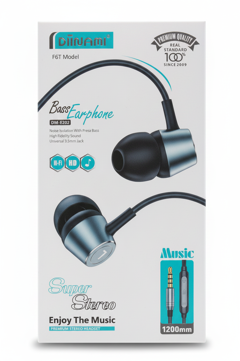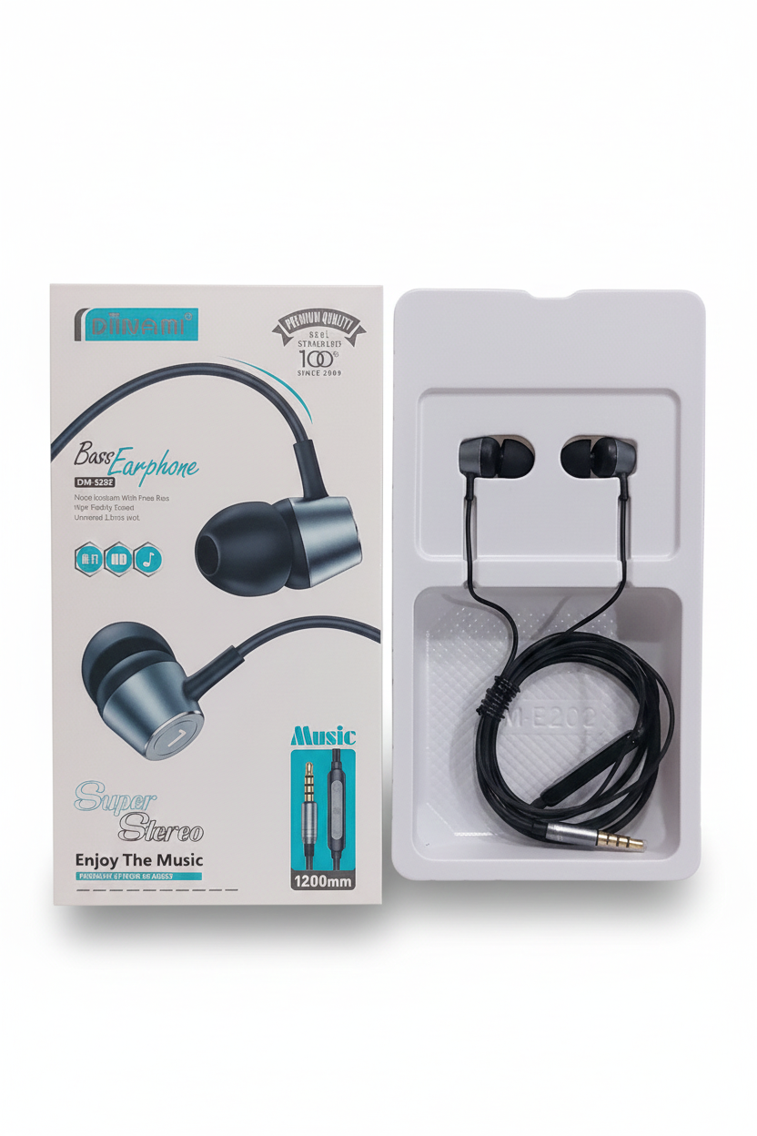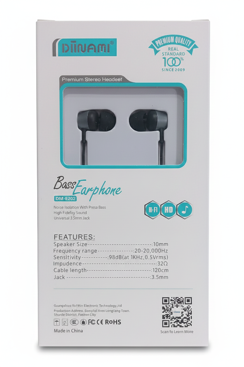 Premium Stereo Sound and Powerful Bass: The Diinami DM-E202 Bass Earphone delivers a SUPER STEREO and premium audio experience. This model is characterized by Noise Isolation With Presa Bass, ensuring deep, resonant sound quality and minimizing outside distractions. It boasts High Fidelity Sound and utilizes a Universal 3.5mm Jack for broad compatibility. Designed for music enthusiasts, this earphone (1200mm long) promises a real standard in quality, with the brand proudly stating "Since 2009."